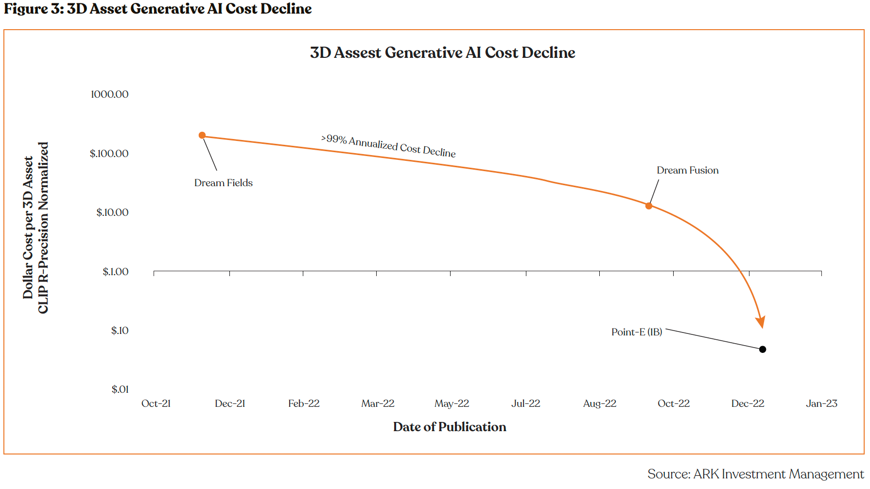A generative AI-enabled drop in time and cost of the in-game user-generated content is another factor propelling the adoption of generative AI. According to ARK Invest, text-to-3D model costs have plummeted by almost 99% in the past year. Some developers have even witnessed a 120:1 reduction in their time to generate concept art for a single image within a game.